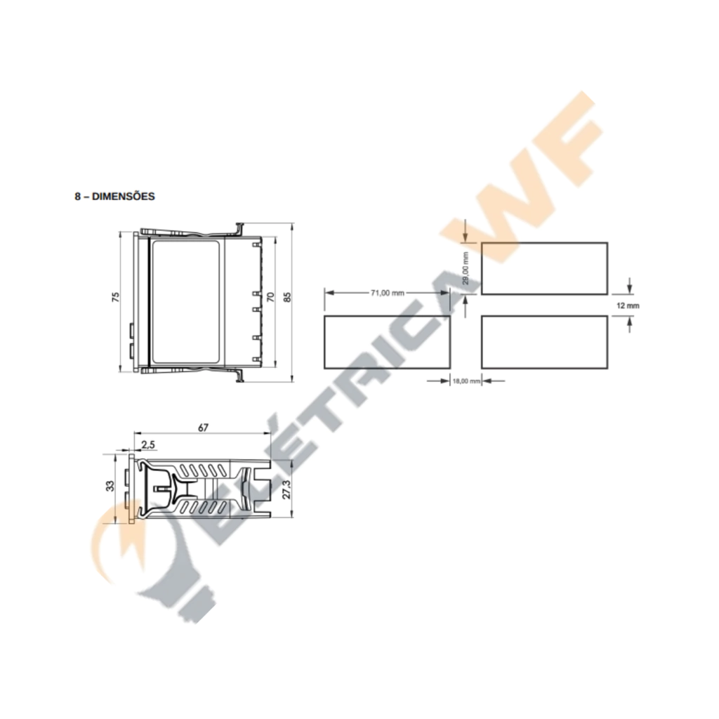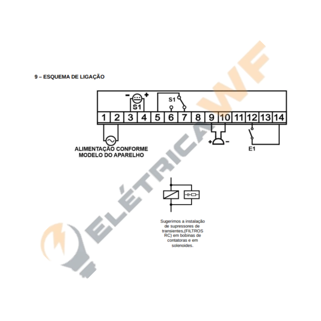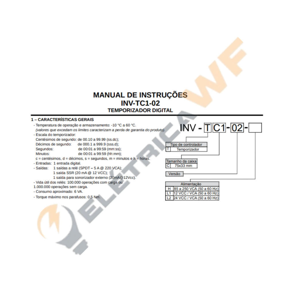CARACTERÍSTICAS GERAIS: - Tensão de Alimentação: 85 a 250 VAC (50~60Hz) - Temperatura de operação e armazenamento: -10°C a 60°C (valores que excedam os limites caracterizam a perda de garantia do produto); - Escala do temporizador: Centésimos de segundo: de 00.10 a 99.99 (ss.dc), Décimos de segundo: de 000.1 a 999.9 (sss.d), Segundos: de 00:01 a 99:59 (mm:ss) e Minutos: de 00:01 a 99:59 (hh:mm), onde: c=centésimos, d=décimos, s=segundos, m=minutos e h=horas; - Entradas: 01 (uma) entrada digital; - Saídas: 01 (uma) saída a relé (SPDT – 5A/220Vca), 01 (uma) saída SSR (20mA - 12Vcc) e 01 (uma) saída para sonorizador/beep/buzzer/campainha externo (20mA - 12Vcc); - Vida útil dos relés: 100.000 operações com carga ou 1.000.000 operações sem carga; - Caixa 75 x 33 x 67 mm; - Consumo aproximado: 6VA; - Torque máximo nos parafusos: 0,5 Nm.