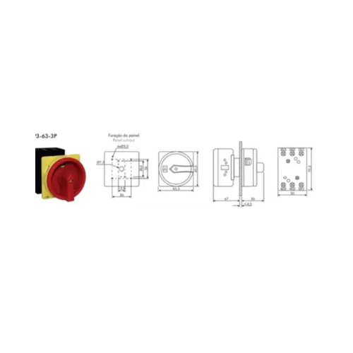 • Corrente Nominal (Ith): 63A • Tensão Nominal de Operação (Ue): 690V • Tensão nominal de impulso suportável (Uimp): 4kV • Grau de proteção: IP30 • Montagem em Painel • Manopla Vermelho/Amarela • Bloqueável por Cadeado