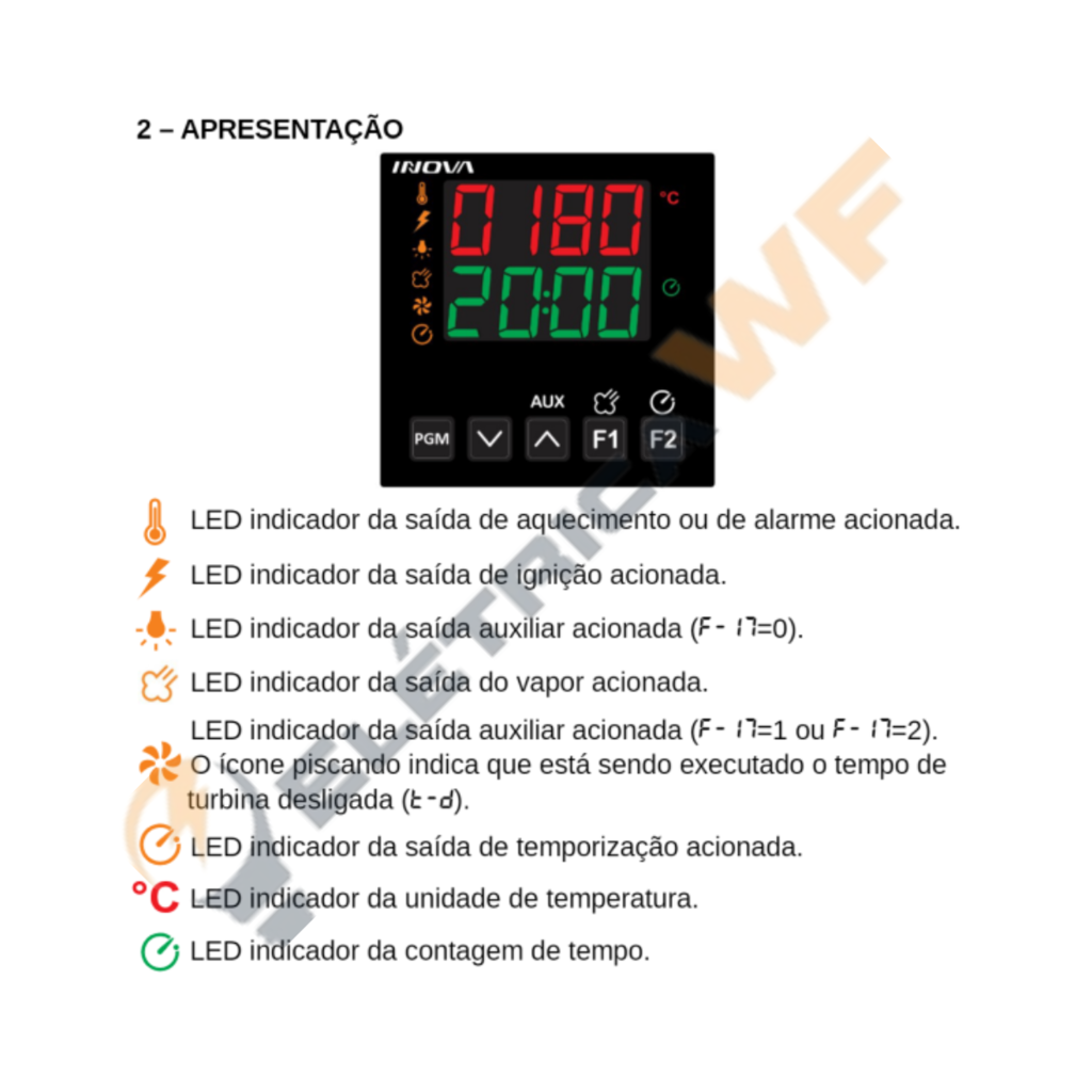- Controlador de tempo e temperatura para fornos a gás, elétrico ou a lenha. - Alimentação: 80~250VCA (50 - 60 Hz) - Temperatura de medição e controle: entre -25°C a 700°C. - Temperatura de operação e armazenamento: entre -10°C e 60°C. - Sensor de temperatura: Tipo J. - Entradas: 01 entrada digital para controle da temporização. - 01 entrada para sensor de chama. - Saídas: 03 saídas a relé 5A - 220VCA (carga resistiva) - 01 saída para beep (12VCC – 20mA máx.) - Caixa plug-in 75 x 75 x 95 mm