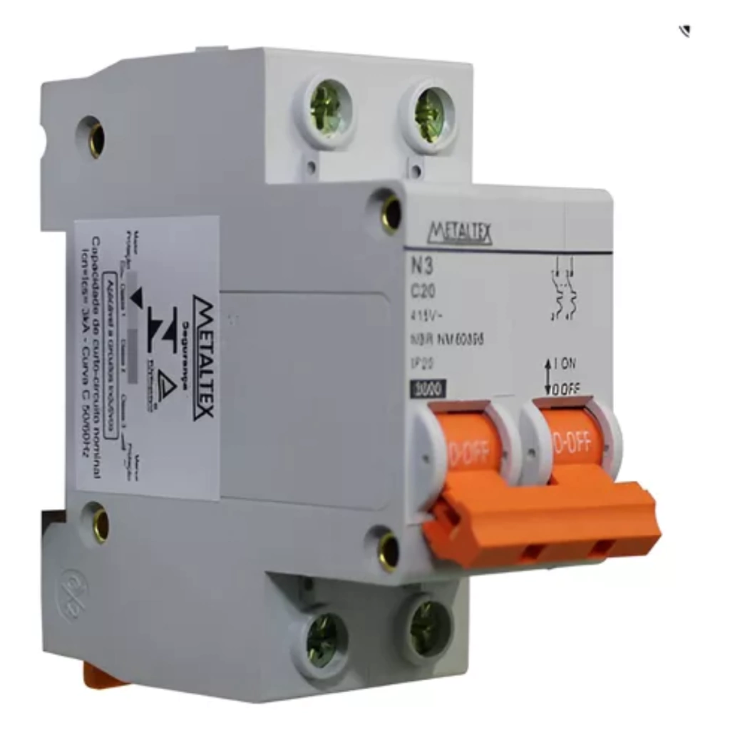 O Disjuntor Bipolar 2A 3kA Curva C N3-2C02 - METALTEX é um componente essencial para a proteção elétrica em instalações residenciais, comerciais e industriais. Projetado com dois polos, este disjuntor bipolar é ideal para circuitos que exigem segurança e eficiência, interrompendo o fluxo de corrente em casos de sobrecarga ou curto-circuito. Com uma corrente nominal de 2A e uma tensão nominal de 240/415V em 50/60Hz, este disjuntor é adequado para uma ampla gama de aplicações. A tensão de isolação de 500V e a capacidade de interrupção de 3kA garantem uma proteção robusta contra falhas elétricas.