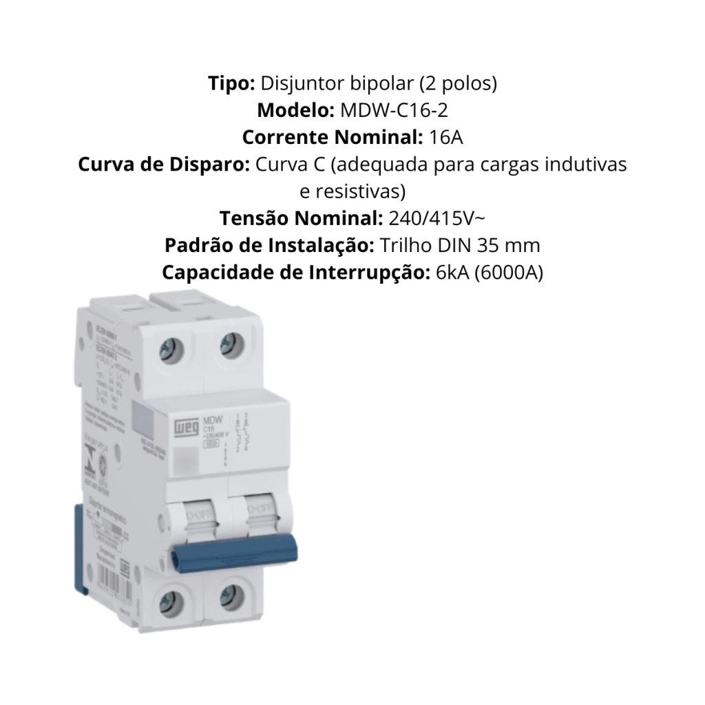 O Disjuntor Bipolar MDW-C16-2 da WEG é projetado para proteger circuitos elétricos contra sobrecargas e curtos-circuitos. Com corrente nominal de 16A e curva C, é ideal para aplicações em circuitos com cargas indutivas e resistivas, garantindo segurança em instalações residenciais, comerciais e industriais. Fabricado com alta tecnologia, o disjuntor WEG oferece durabilidade e confiabilidade.